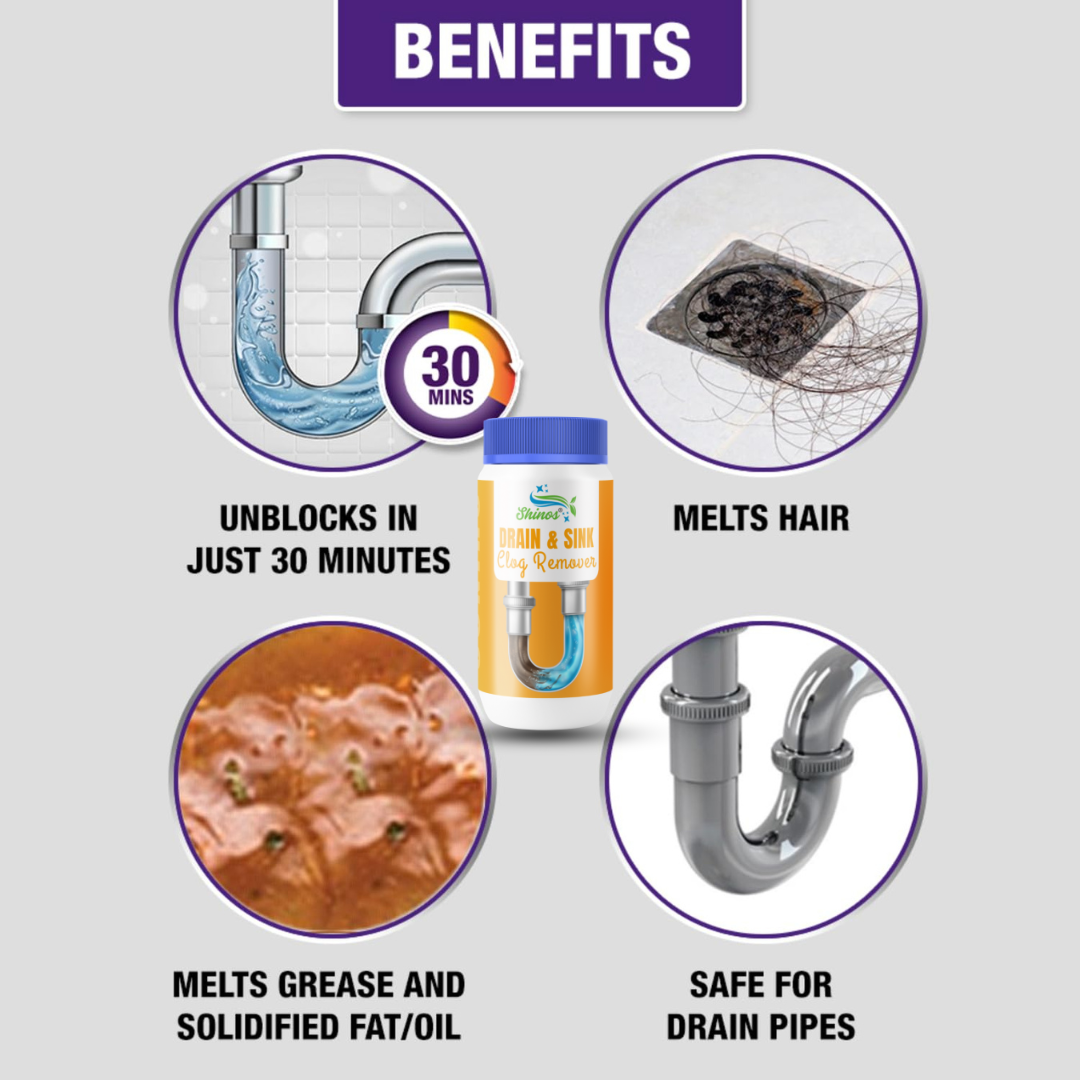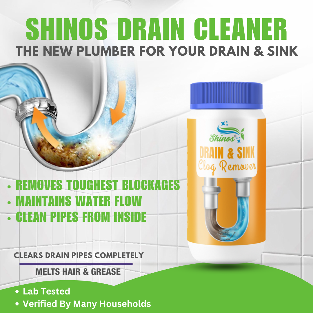 - CLEARS BLOCKAGES IN 30 MINUTES - Shinos Powerful Drain & Sink cleaner which clears blockage in wash basins, sinks, bathrooms and other drain pipes within 30 minutes